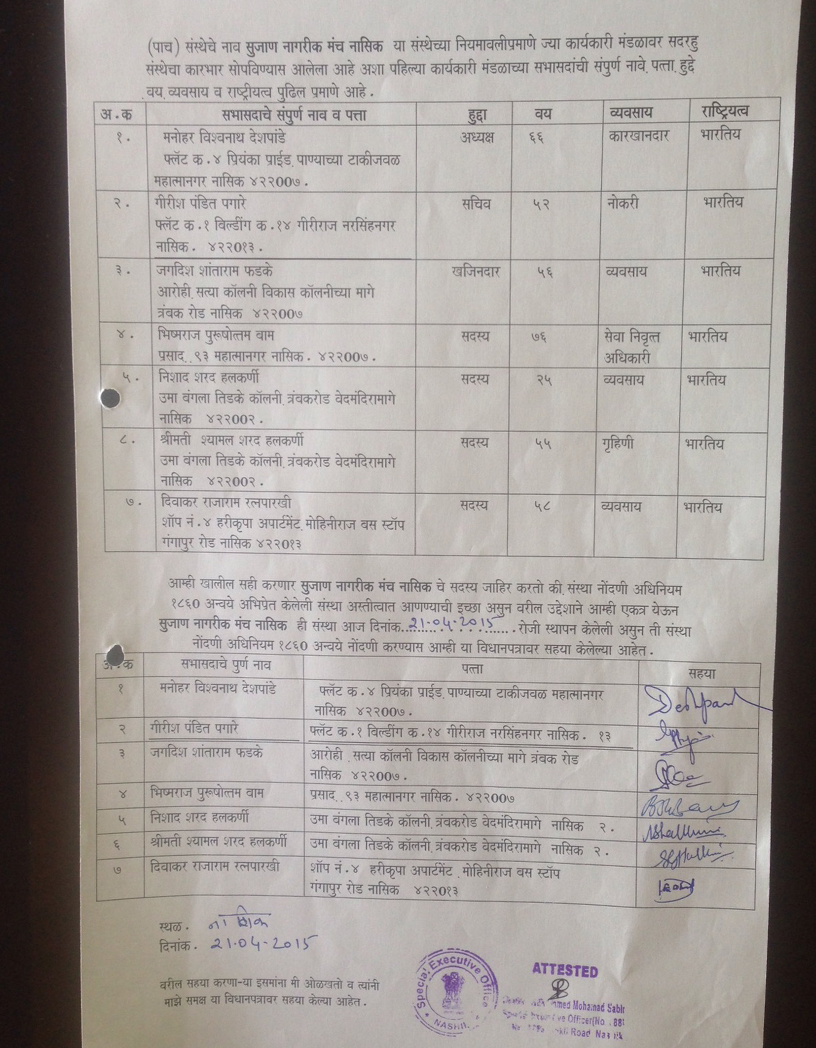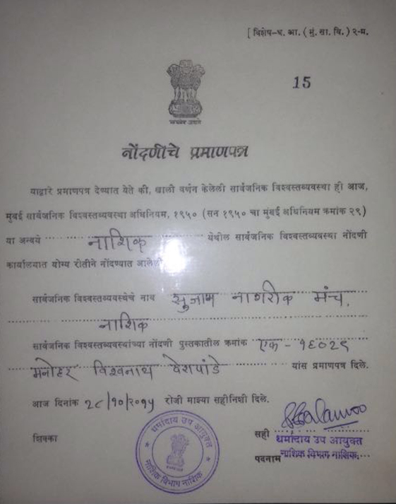Sujan Nagarik Manch (SNM) is forum of conscientious citizens created under the guidance of Late Shri. Bhishmaraj Bam to actively participate in improving quality of life in general by their own efforts as well as by creating awareness in the society. The SNM is a non-political and non religious body, and does not discriminate against any one on the basis of cast, creed, race, religion or gender.Though SNM was initiated with special emphasis on cleanliness (swach bharat), It has been taking up different initiatives and activities for the benefit of all sections of the society as per the need of the hour.
